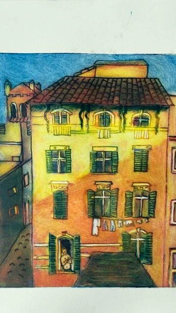 I recently completed the monoprint of Trastevere (pictured below), the very place where I found the old lady decades ago. It’s a tribute to Professore Barriviera, who taught me to capture what’s around me and helped launch my lifelong journey in printmaking.