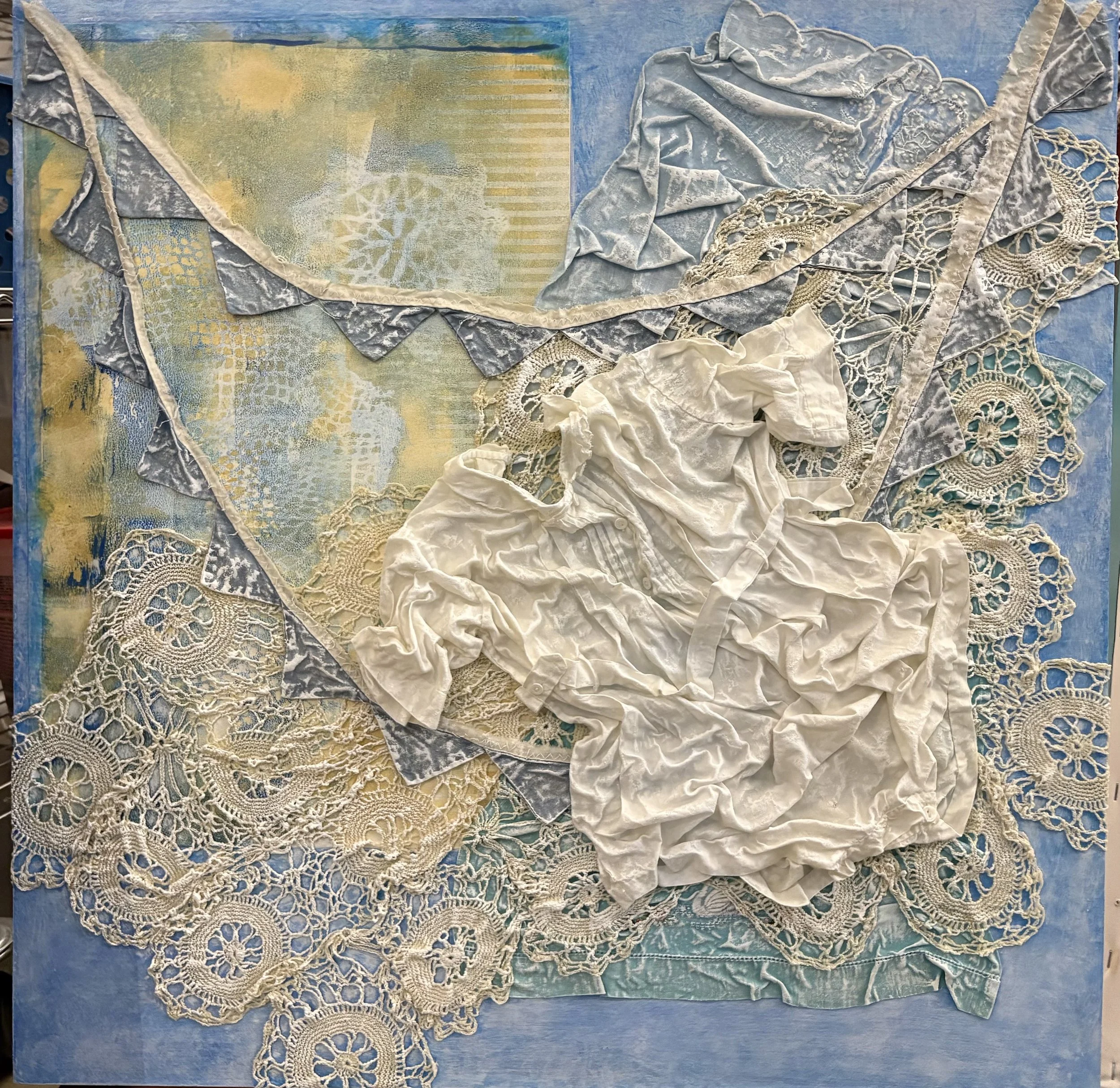 IMPRINTED MEMORIES - 24” x 24” - Gelli print & vintage hand crocheted laces & cotton onesie on wood panel
