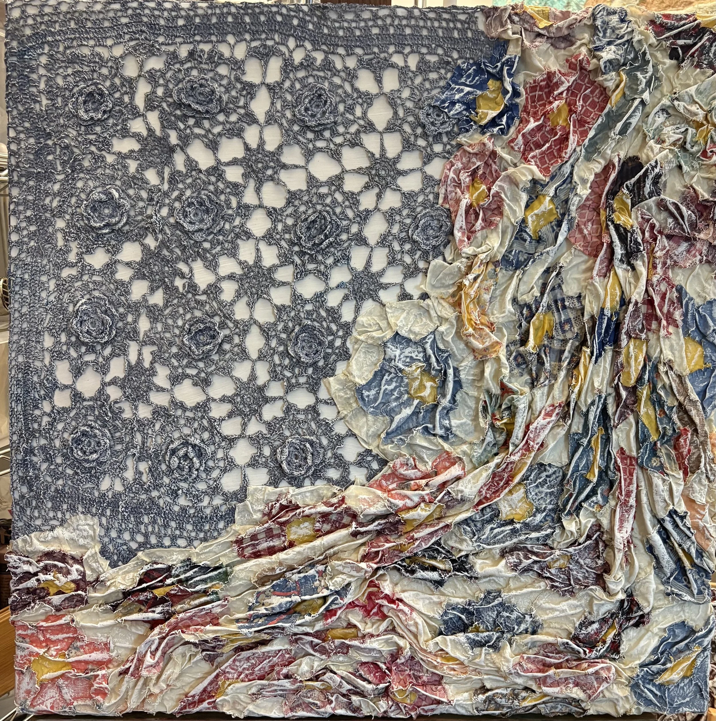 GRANDMA SKILLS - 24” x 24”, hand crocheted lace & quilted textile on wood panel