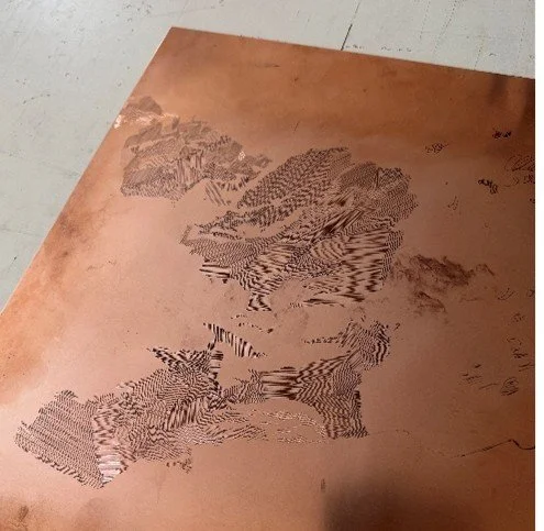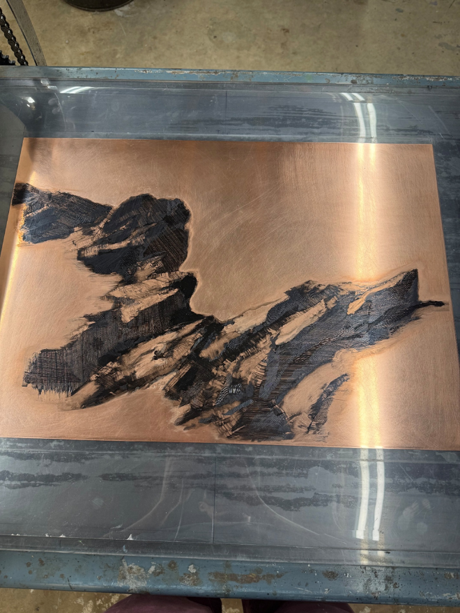 Using a special type of chisel called a burin, Demaria engraves the copper and carves out crevasses that hold ink.