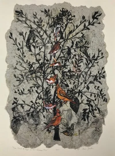 Our three-generation exhibit, Sophie’s lights, Ann’s linoleum cuts on plant-based papers, and Julie’s bird collages, has a holistic feel, as light feeds plants and plants feed birds. It also demonstrates how the depiction of nature has shifted and evolved over the course of three generations.